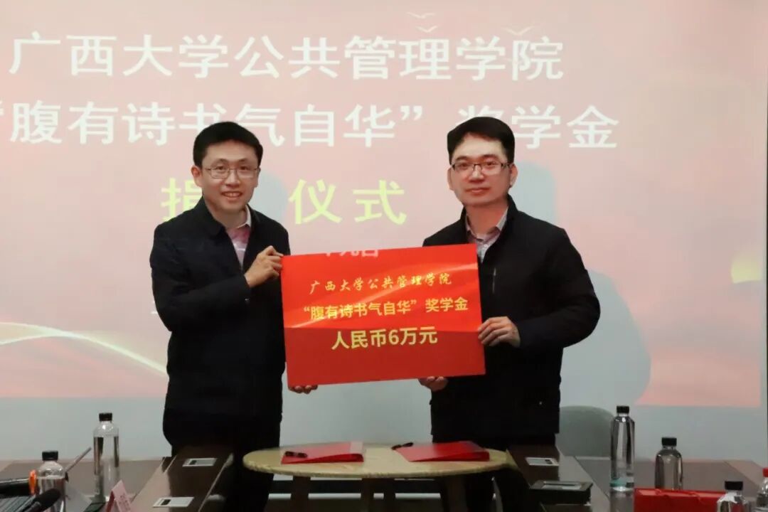 本次捐赠仪式在热烈而温馨的氛围中圆满结束。“腹有诗书气自华”奖学金的设立,凝聚了李林颖、李佳洁和邱咏茵三位爱心人士饮水思源的深厚情谊,更生动诠释了他们作为新时代青年干部向上向善的崇高品格。这份承载着关爱与期许的善举,将激励更多易世博 学子潜心向学,将“诗书”内化为精神底色,将“服务社会”外化为人生追求,在为奋力谱写中国式现代化广西篇章的进程中书写人生华章。
